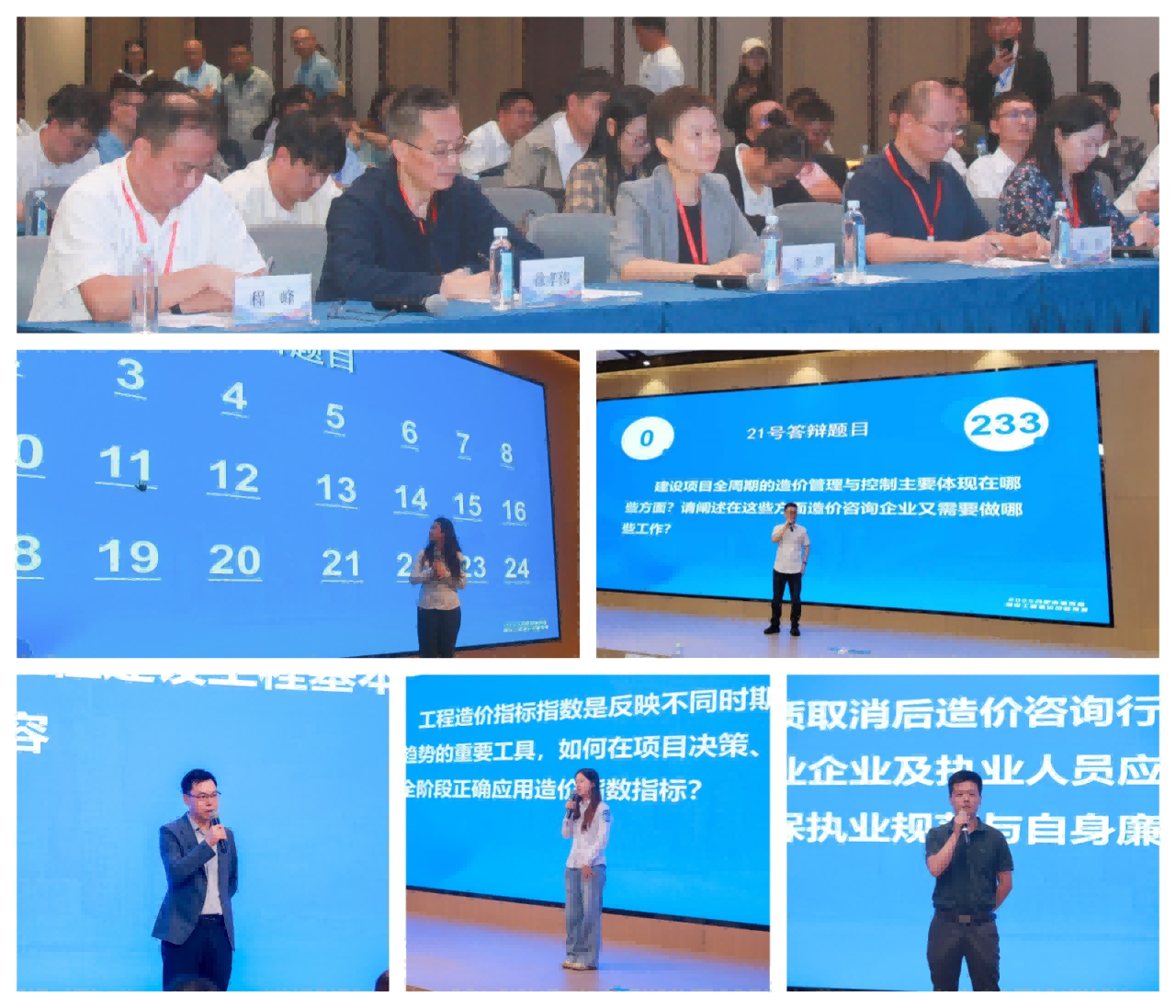 答辩环节更加紧张激烈。24名选手按抽签顺序依次上场,随机抽取题目进行即兴作答。选手沉着冷静,展现出扎实的专业功底与优秀的应变能力。评委从专业素养、语言表达、临场表现等多维度进行严格评审,并围绕行业发展趋势、新技术应用、造价咨询服务的转型升级等议题与选手深入交流,提供宝贵的专业指导和建议。